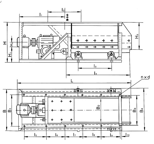 槽式給料機可以架設于地面,也可以吊裝在礦倉卸料口上。槽底板作往復運動,其沖次為 20-60 次/min, 沖程為20-200mm。沖程可由驅動裝置偏心輪進行適當調整,偏心距為沖程之半。